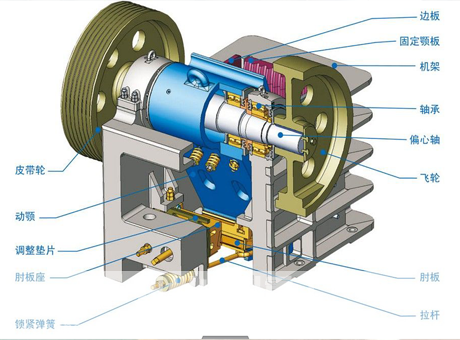 電動機(jī)驅(qū)動皮帶和皮帶輪,通過偏心軸使動顎上下運(yùn)動,當(dāng)動顎上升時(shí)肘板與動顎間夾角變大,從而推動動顎板向固定顎板接近,與此同時(shí)物料被壓碎或劈碎,達(dá)到破碎的目的;當(dāng)動顎下行時(shí),肘板與動顎間夾角變小,動顎板在拉桿、彈簧的作用下,離開固定顎板,此時(shí)已破碎物料從破碎腔下口排出。隨著電動機(jī)連續(xù)轉(zhuǎn)動而破碎機(jī)動顎作周期性地壓碎和排泄物料,實(shí)現(xiàn)批量生產(chǎn)。